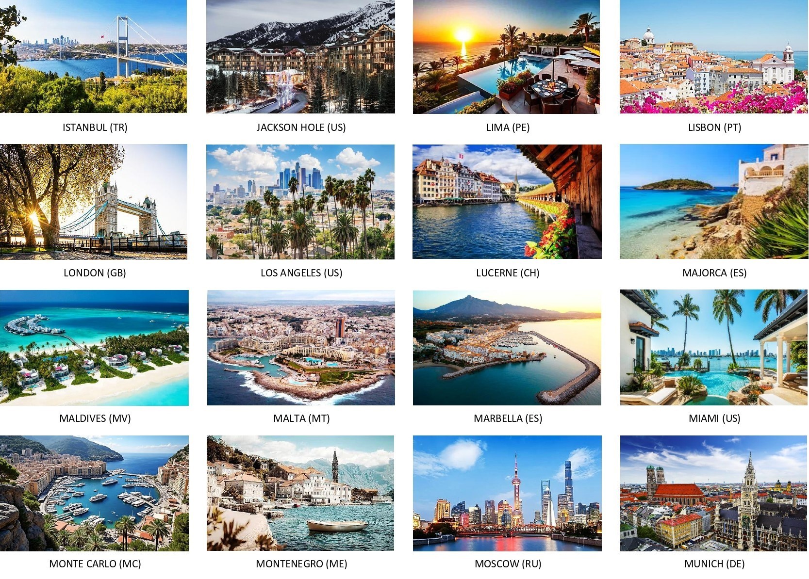 Some of the world's most popular Luxury Real Estate attractions illustrated in alphabetical order